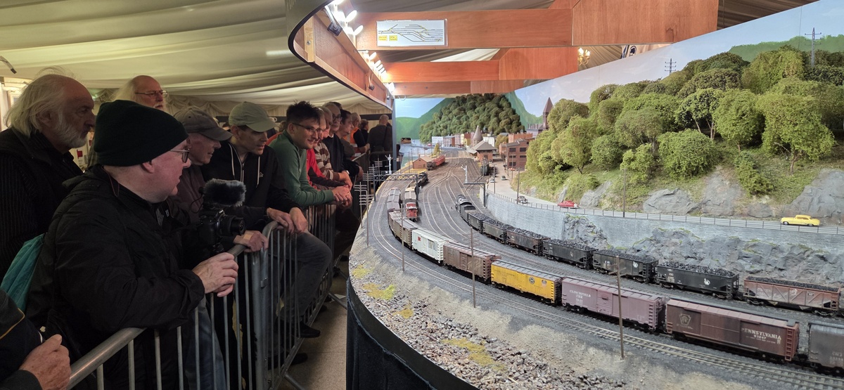 The layout ran well initially, but later the Lenz control system overheated on several occasions. The Peco point motors in the fiddle yard throat also began to fail on day two and needed considerable fettling to keep them working. The crowd was excellent on all three days, and many were very complimentary.
