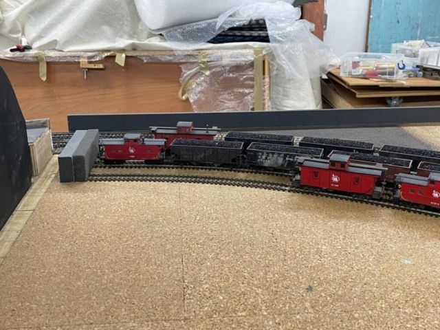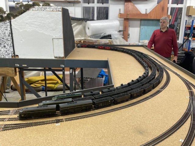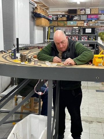 Over the last week, a team at Barrowmore, led by Richard and comprising Kevin Bays, Mike Rapson and Phil Sutton, set about laying some additional roads at one end of the staging yard. The first project was to add three terminating sidings off yard track East 1. These are long enough to hold a full length coal train and, with East 1 used as a clear through track, will allow for trains to be backed in and pulled out as required – essentially adding three tracks to the eastbound staging. The new switches were connected to Digikeijs boards.
