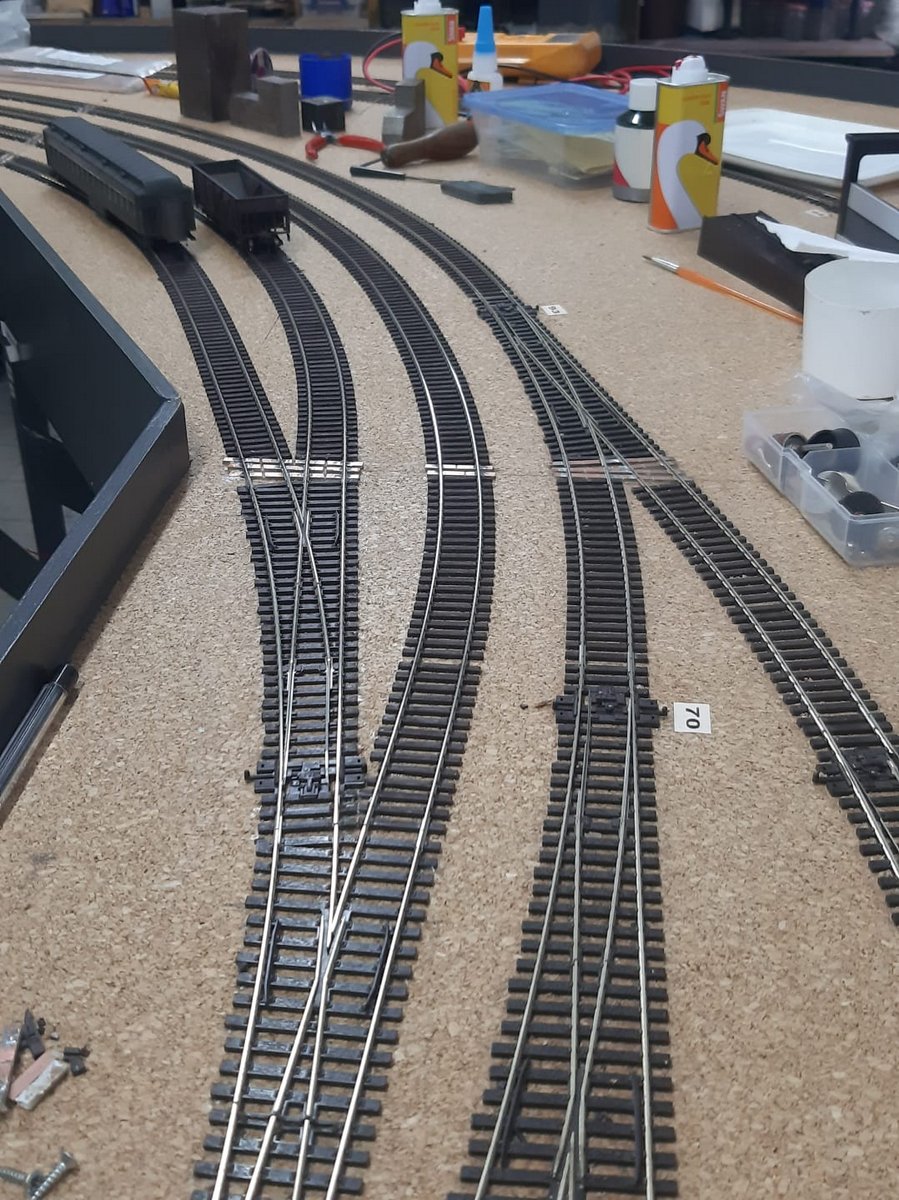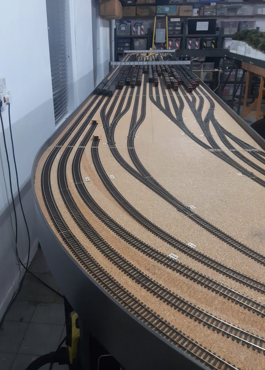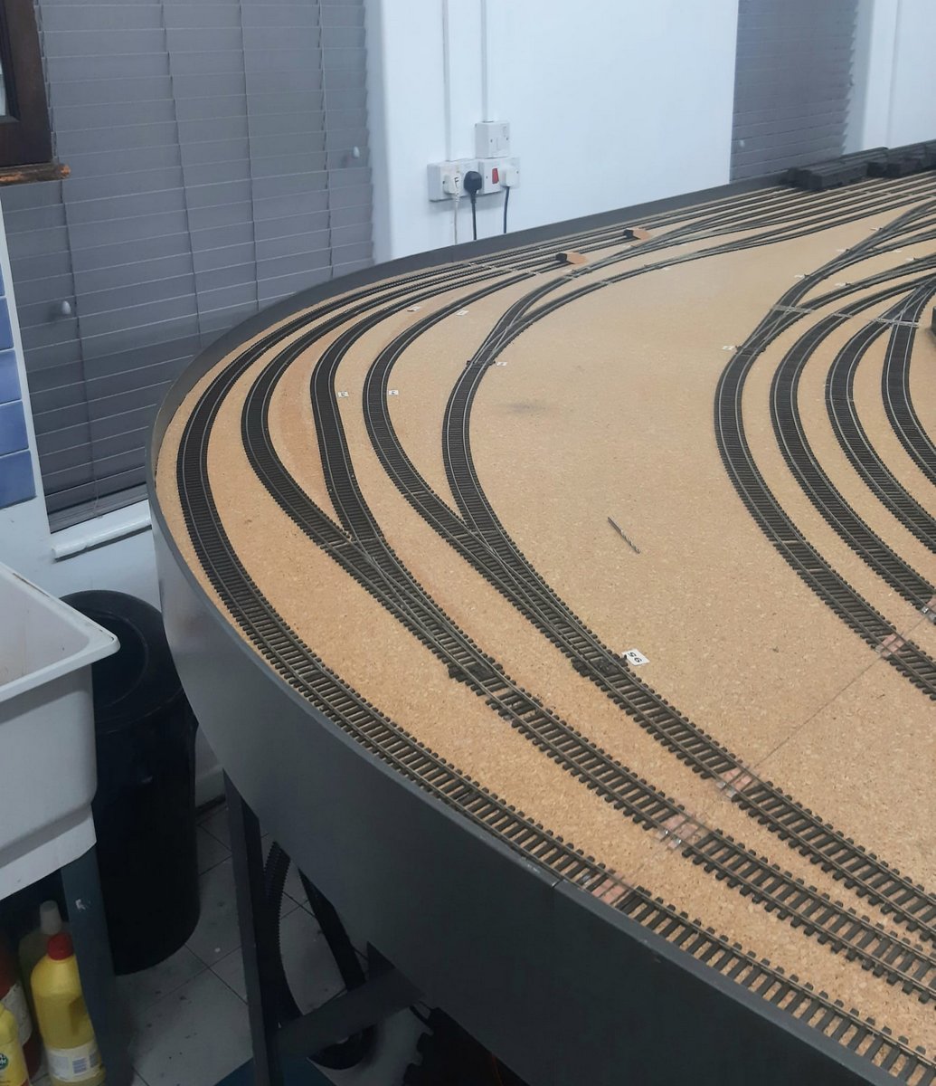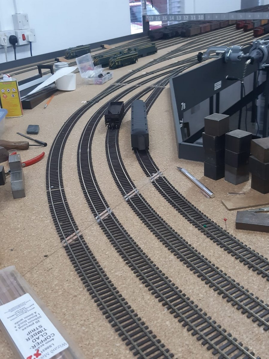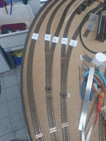 Later in the week, a decision was taken to lengthen two westbound tracks on the outside of the yard. Richard and Kevin lengthened yard track West 17 all the way round to just before the scenic section and track West 16 through to join slightly earlier. Whilst not adding extra tracks, the extra space available with multiple occupancy on each track is equivalent to two extra tracks. The two terminating tracks for passenger trains were also repositioned as shown: