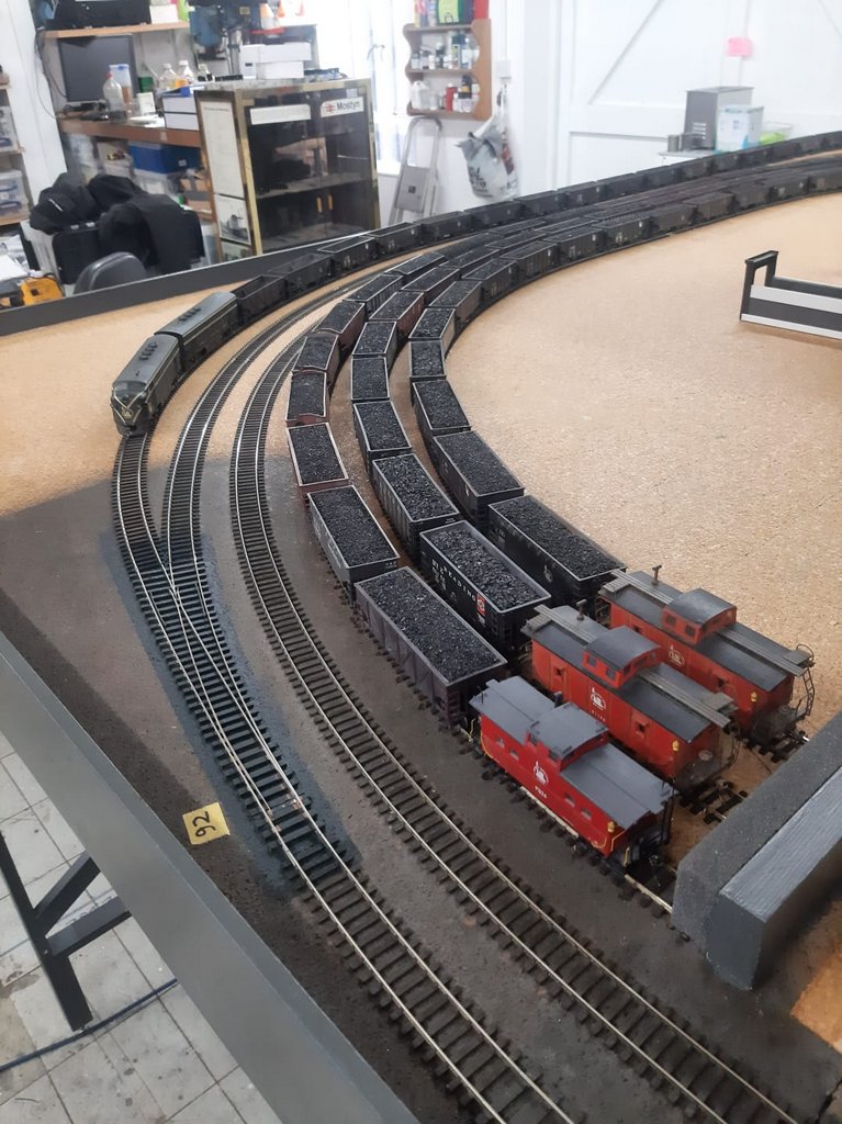 Later in the week, a decision was taken to lengthen two westbound tracks on the outside of the yard. Richard and Kevin lengthened yard track West 17 all the way round to just before the scenic section and track West 16 through to join slightly earlier. Whilst not adding extra tracks, the extra space available with multiple occupancy on each track is equivalent to two extra tracks. The two terminating tracks for passenger trains were also repositioned as shown:
